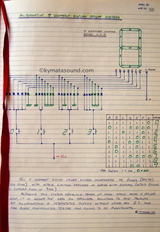 In spite of the haircut, I passed with distinction, in part due to the fact that I was the only one in the class to solve a set problem. The problem the class had been set was to design a 7 segment display driver using only discrete components; apart from the 7 segment display itself, we were not allowed to use chips. I proposed a theory and wrote it up in my notes: To prove to the lecturer, class and myself that my theory was correct, I knocked up a working model: