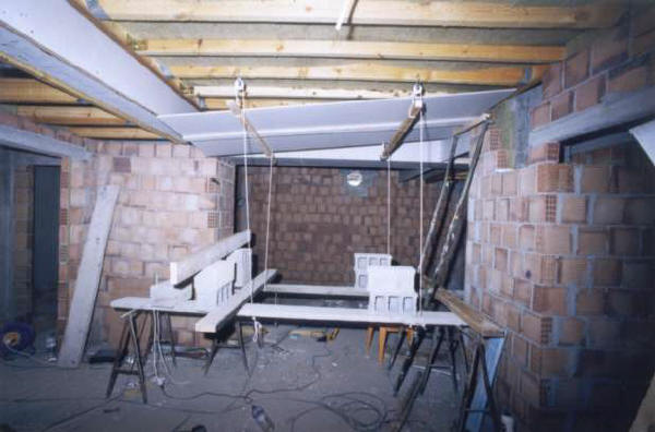 A 4mm bituminous rubber dead sheet was laid before work on the isolated control room walls commenced. Neoprene is often specified as an isolation medium but, after extensive load testing, we choose the dramatically cheaper option of 30mm fire retardant dense Styrofoam. Made by Dow Chemicals and sold under the trade names Wallmate and Roofmate the blue Styrofoam is light and easy to cut with a serrated knife. Strips of Styrofoam, weighted down with bricks, mark out the control room front walls ready for the bricklayer. In the left hand triangle is a cardboard template. This was used on both left and right sections to ensure an exact mirror image and maintain the critical alignment of the 30 degree angled walls.